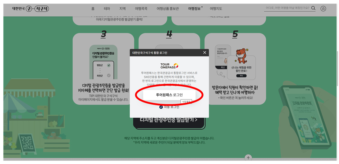 3. 디지털관광주민증을 선택하면 투어원패스 로그인 창이 뜹니다. 로그인을 눌러주세요.