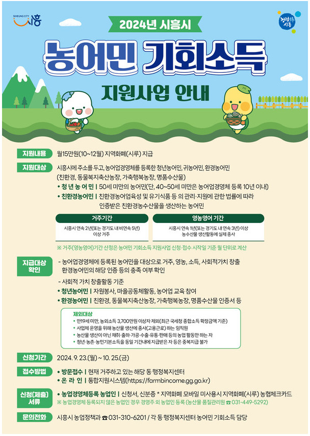 경기도 기회소득 중 하나인 농어민 기회소득 접수가 시작되었습니다. 시흥시는 9월 23일부터 10월 25일까지 접수를 합니다. 꼭 신청하셔서 혜택받으세요. 월 15만원의 지역화폐(시루)가 지급됩니다.