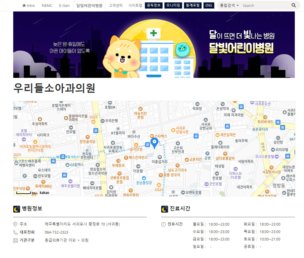 소아 경증환자를 위해 야간 진료를 하는 소아과입니다. 영유아와 어린이들은 밤에 아픈 경우가 많습니다. 엄마 아빠가 퇴근한 후에야 살피게 되는 경우도 많구요. 그런 가정들을 위해 야간에도 운영하는 소아과가 있습니다. 동네마다 야간진료를 하는 병원들이 있어도 막상 찾으려면 쉽게 찾아지지 않습니다. 그럴 땐 달빛어린이병원 검색서비스를 이용해 보세요.. 중앙응급의료센터에서 운영하는 야간 휴일 병의원, 약국 검색 서비스인데, 달빛어린이병원이라고 해서 특별히 소아과를 따로 구분하여 서비스하고 있습니다.