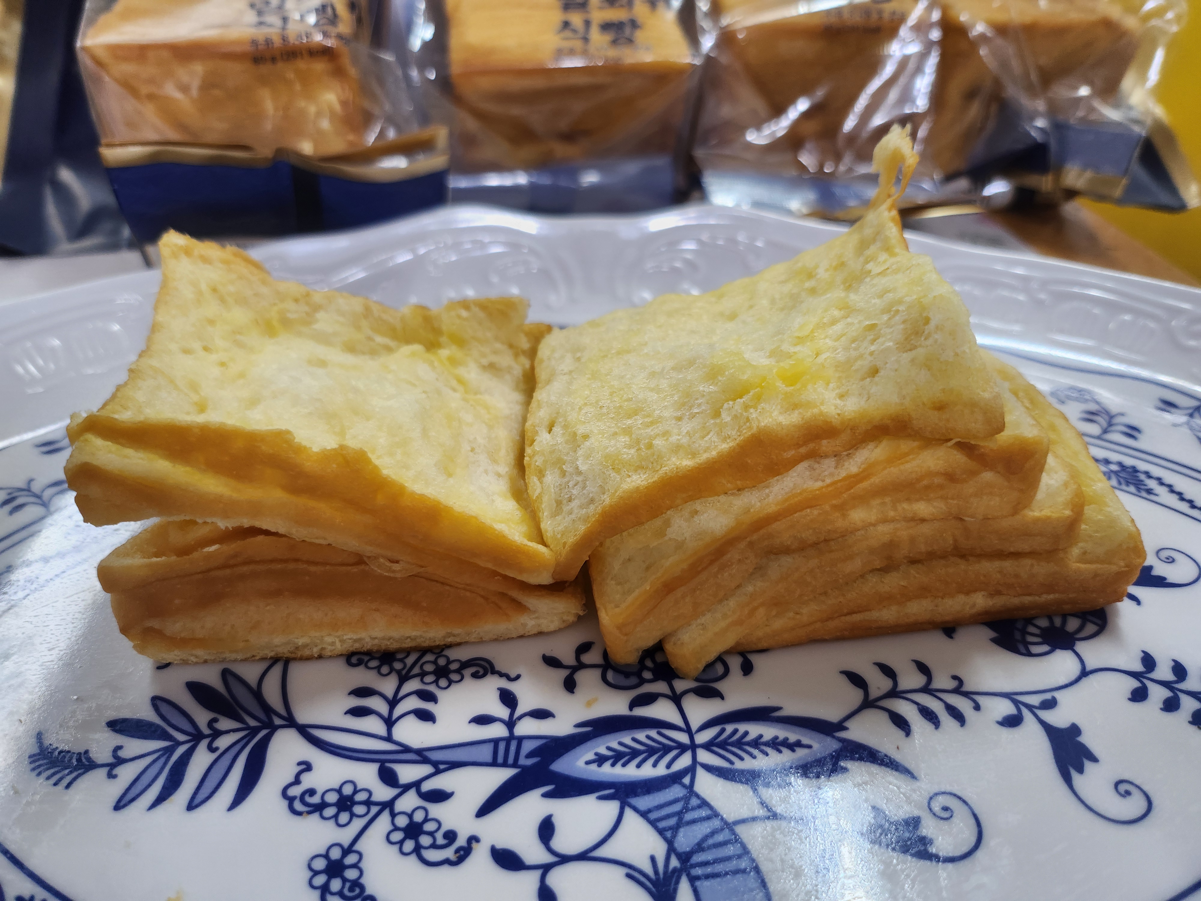 그래도 일반 식빵과는 다르게 얇게 떨어져서 겹겹이 떼어먹는 재미가 있습니다.