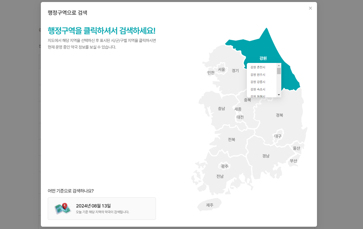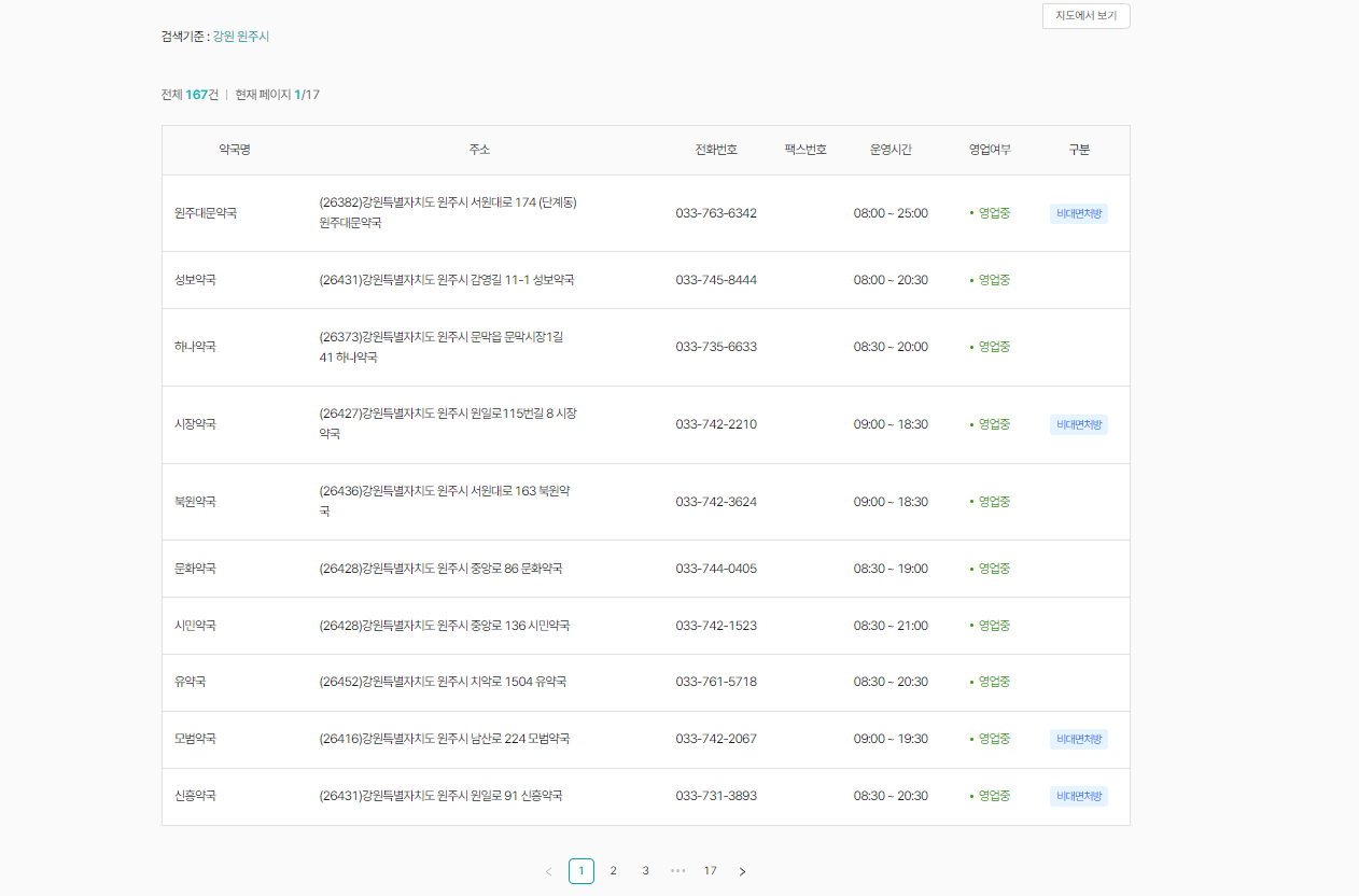 지도에서 원주시를 클릭하면 관내 약국 정보가 목록형으로 검색됩니다.