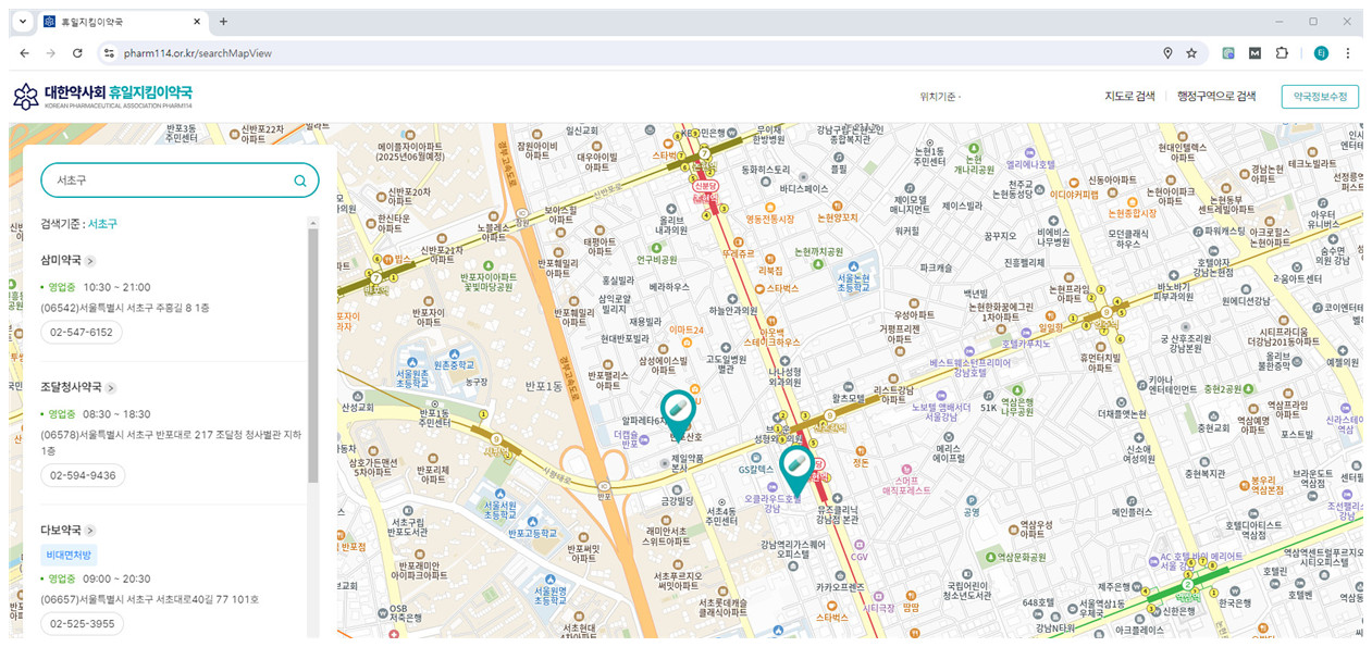 대한 약사회에서 운영하는 홈페이지로 기타 잡다한 화면 없이 약국만 검색하기에 좋습니다.