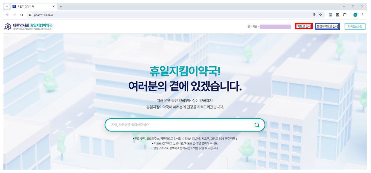 위치정보 동의 후 검색창에 주소나 약국 이름을 입력하거나